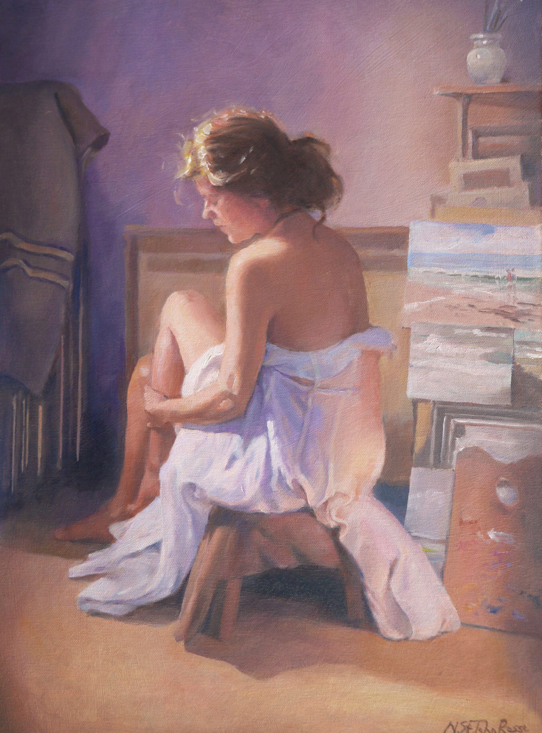 ‘Model in the Studio’ captures a sense of creative focus and artistic process. The composition, suffused with natural light, emphasises the quiet determination of the model as she sits amidst the tools and canvases of the workspace. Gentle brushstrokes and carefully balanced colours evoke an atmosphere of inspiration, celebrating the interplay between muse and artist.